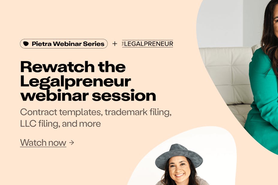 Watch the Legalpreneur webinar session hosted by Andrea Sager in partnership with Pietra. Watch the video below of the full session to learn about contract templates, trademark filing, LLC filing, and more