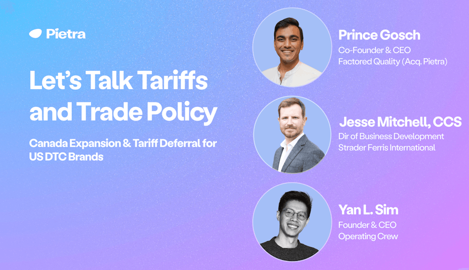 To help founders and operators navigate this moment, Pietra hosted a live webinar with Yan Sim, founder of Operating Crew, and Jesse Mitchell, Director of Business Development at SFI Group. The conversation explored how U.S. brands can use Canada as a dual-purpose strategy: a way to defer duties and access new e-commerce markets.