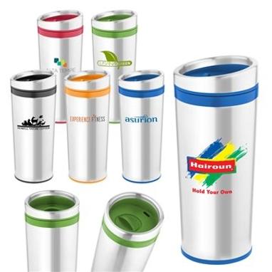 16 oz. double wall tumbler with stainless steel outer and color plastic liner; stainless/plastic lid with slide lock prevents spills; fits in most cup holders.