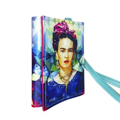 Wallet with magnetic clasp, hand strap, space for cards, bills and coins.