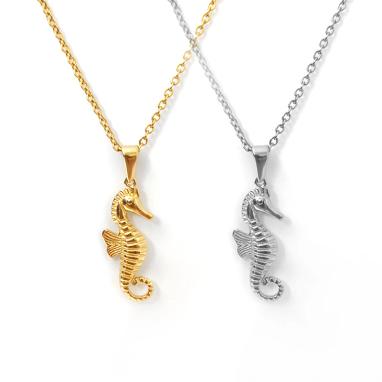 gold plated seahorse necklace, wholesale ocean jewelry, dainty stainless steel pendant, summer beach necklace, waterproof seahorse charm, women's ocean themed jewelry, trendy marine pendant, coastal style gift, lightweight gold tone necklace, bulk jewelry supply, vacation ready jewelry, seahorse lover gift, 18K gold finish necklace, durable ocean jewelry, fashion wholesale accessories